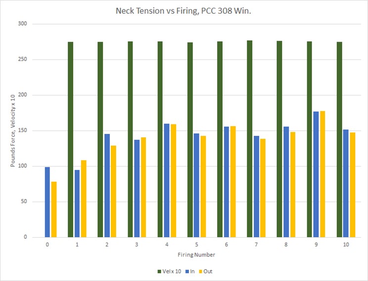 You can see from the chart that neck tension rose after each of the first four firings. Then it somewhat leveled off after that. You can also see that muzzle velocity stayed consistent from the first firing through the tenth.